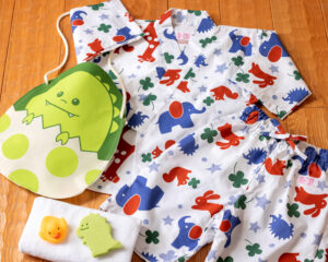 ▲お子様用レンタル甚平とアメニティセット(恐竜)