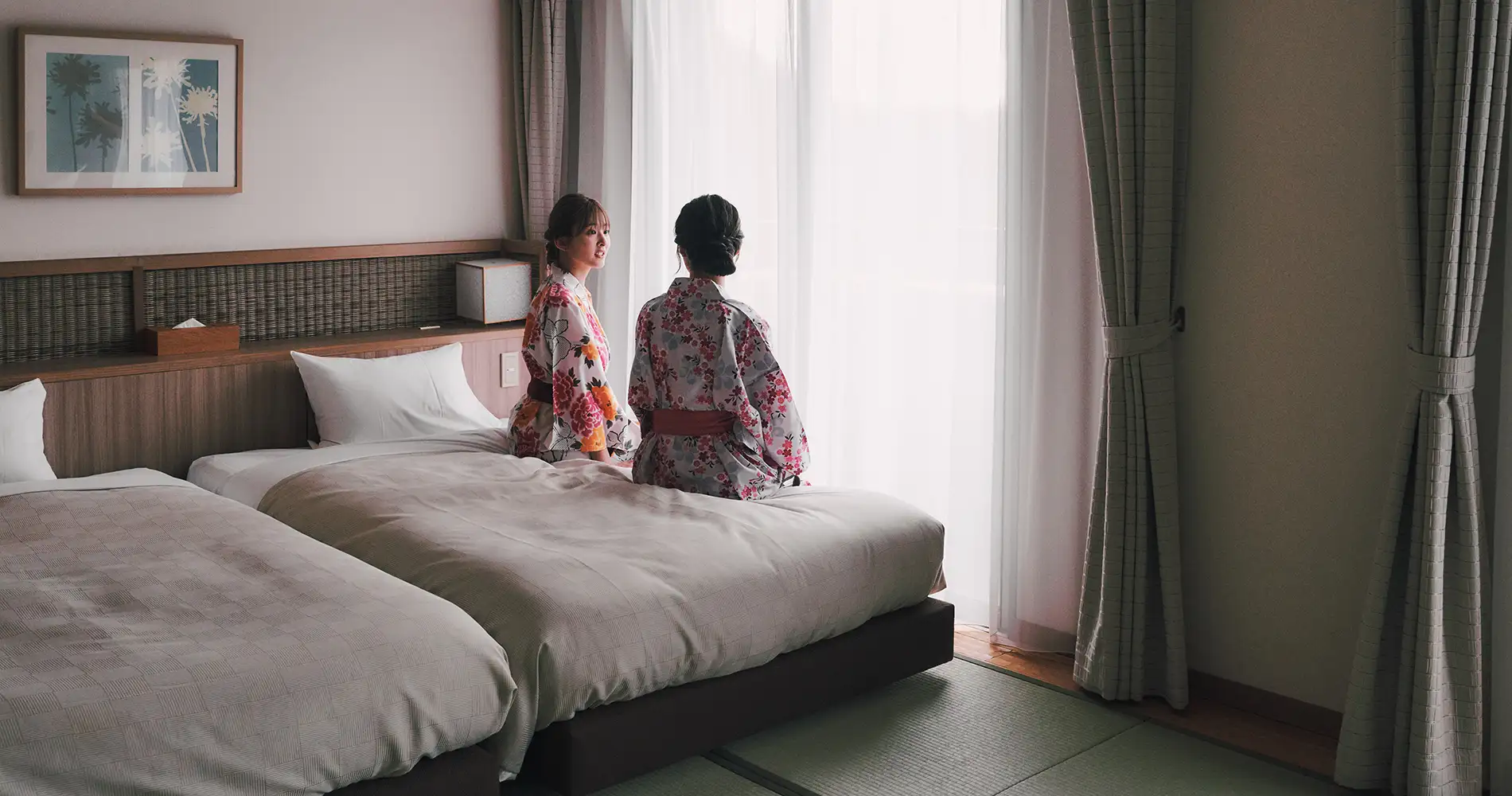 這間客房配有 2 張低床鋪在琉球榻榻米墊上,結合了日式房間的「放鬆」與西式房間的「舒適」感。從窗戶看到雲仙的自然和房間的現代氛圍營造了一個舒適的空間。