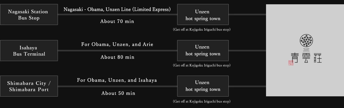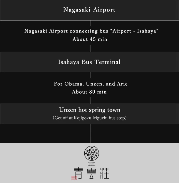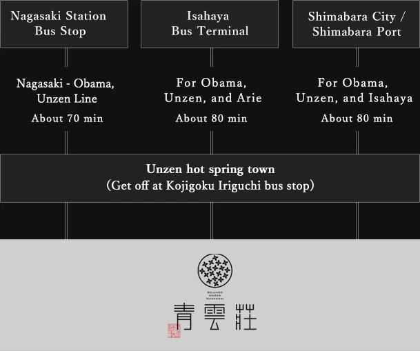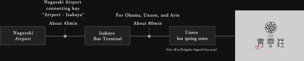 ■By Bus:Please note that there is no direct bus service from the airport to Unzen, so you need to transfer in Isahaya.We provide free transportation if you are near the Unzen hot spring town.