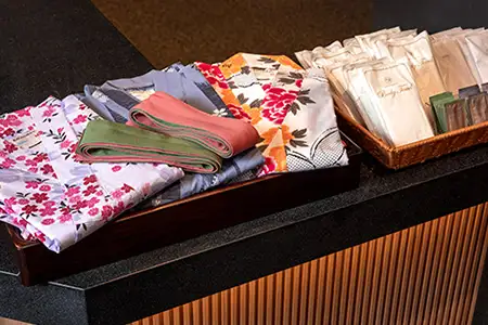 1階アメニティバーではクレンジングなどアメニティ類の他、彩とりどりのレンタル浴衣をご用意しております。お気軽にご利用ください。(※数に限りがあります)